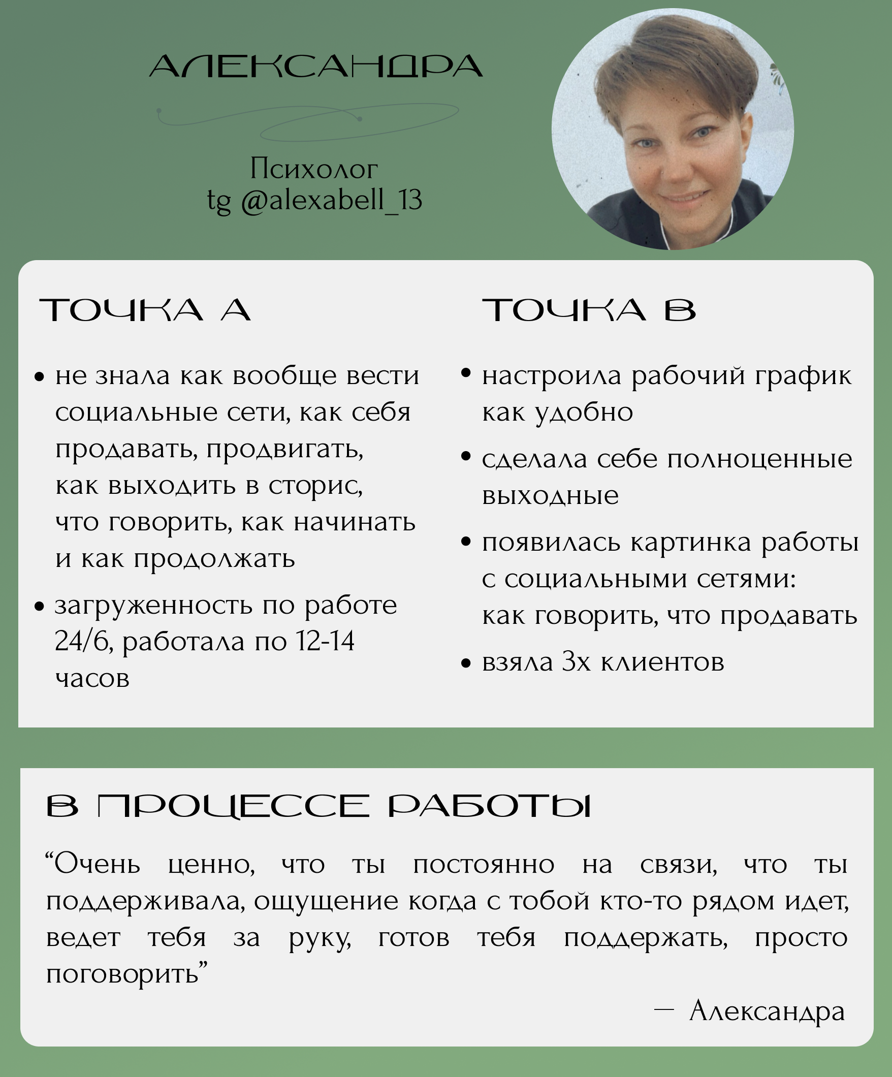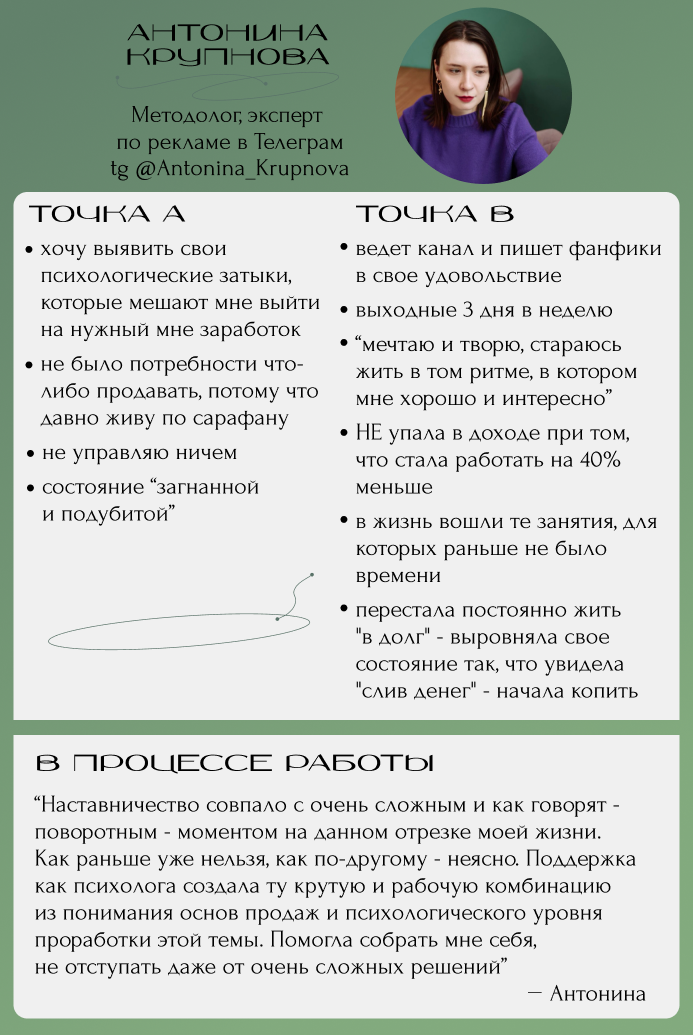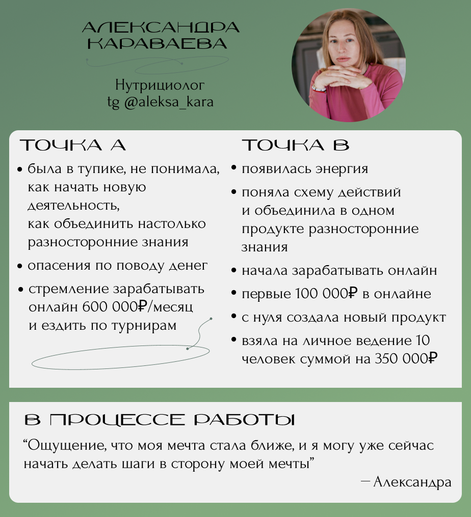 Записывайтесь на диагностическую сессию, где получите разбор вашей ситуации, что мешает расти, зарабатывать, двигаться в своей профессии. Я помогу вам увеличить продажи или даже начать зарабатывать с нуля. Вам будет предоставлен индивидуальный разбор от меня, как от эксперта, на основе моего опыта и компетенций. Я подскажу пути решения ваших запросов и проблем, помогу найти точки роста